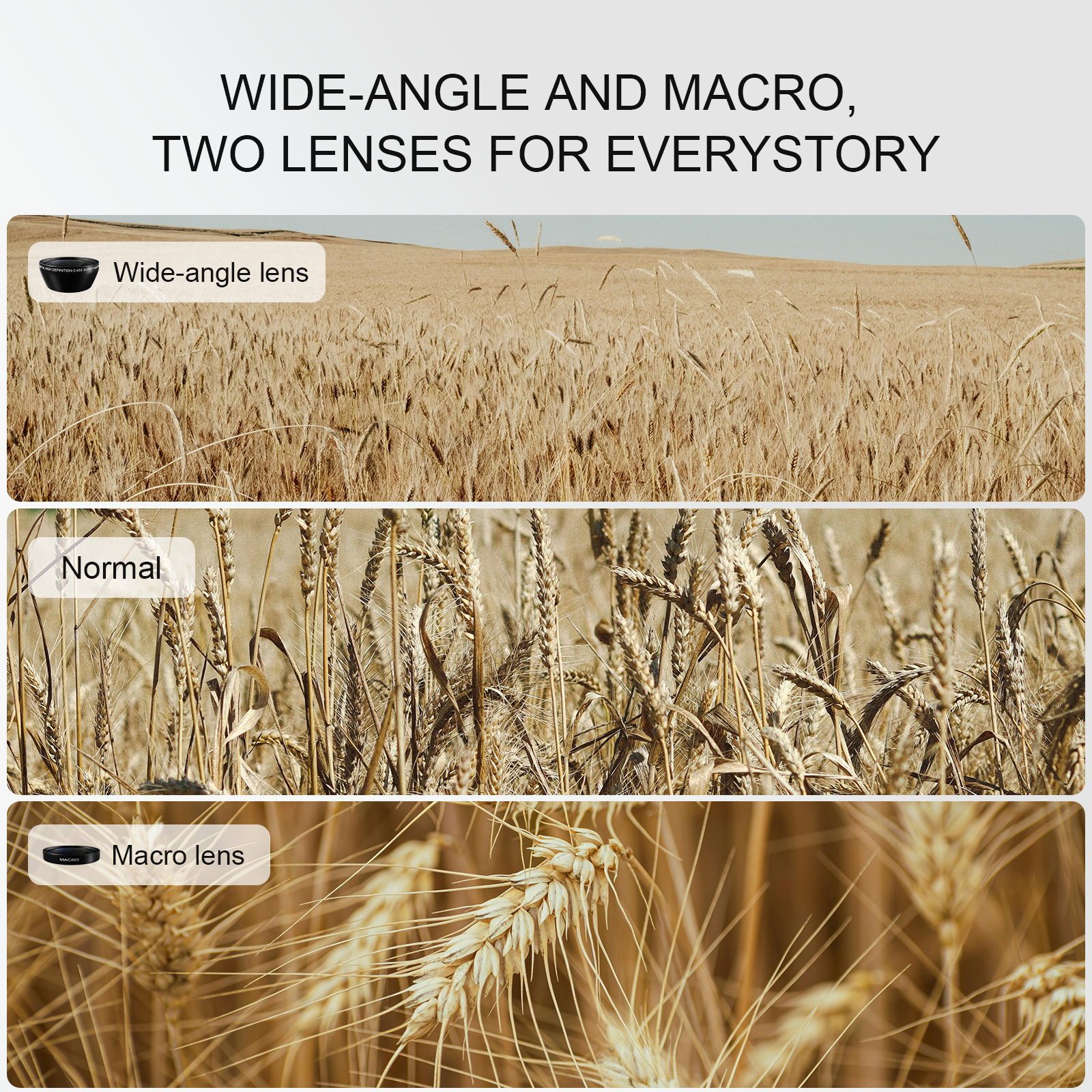 The combination of wide-angle and macro lenses offers dual perspectives, stimulating your creative inspiration.Equipped with a wide-angle lens, capture a broader view.The macro lens allows you to explore the microscopic world, capturing the beauty of details, from the texture of flowers to the wings of insects, all within your grasp